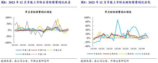 寿险保费月度数据:2023年12月5家上市险企寿险总保费合计813亿元、同比+5.0%,增速较11月改善9.2pct,其中:中国太保+16.7%、中国人寿+13.0%、中国人保+5.8%、中国平安-1.9%、新华保险-2.9%,上市险企单12月保费环比略有分化。人身险板块2023年全年景气度较高,2023年全年寿险总保费累计同比分别为:中国人保+9.1%、中国平安+5.8%、中国太保+4.9%、中国人寿+4.3%、新华保险+1.7%。