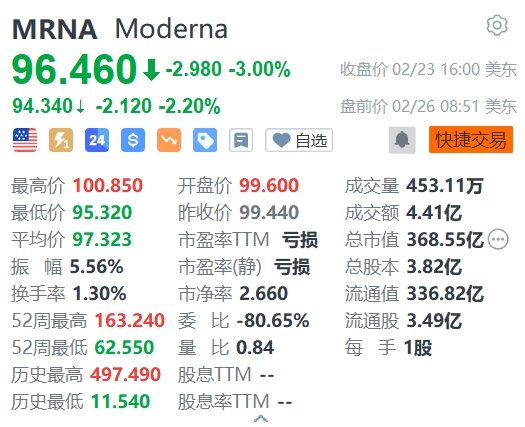 Moderna(MRNA.US)美股盘前跌2.2%,报94.34美元。此前汇丰银行将Moderna的评级从持有下调至减持,并对Moderna的mRNA疫苗的整体市场潜力持谨慎态度,预计公司最高销售额为17亿美元,处于15亿至24亿美元的一致预期区间下限。